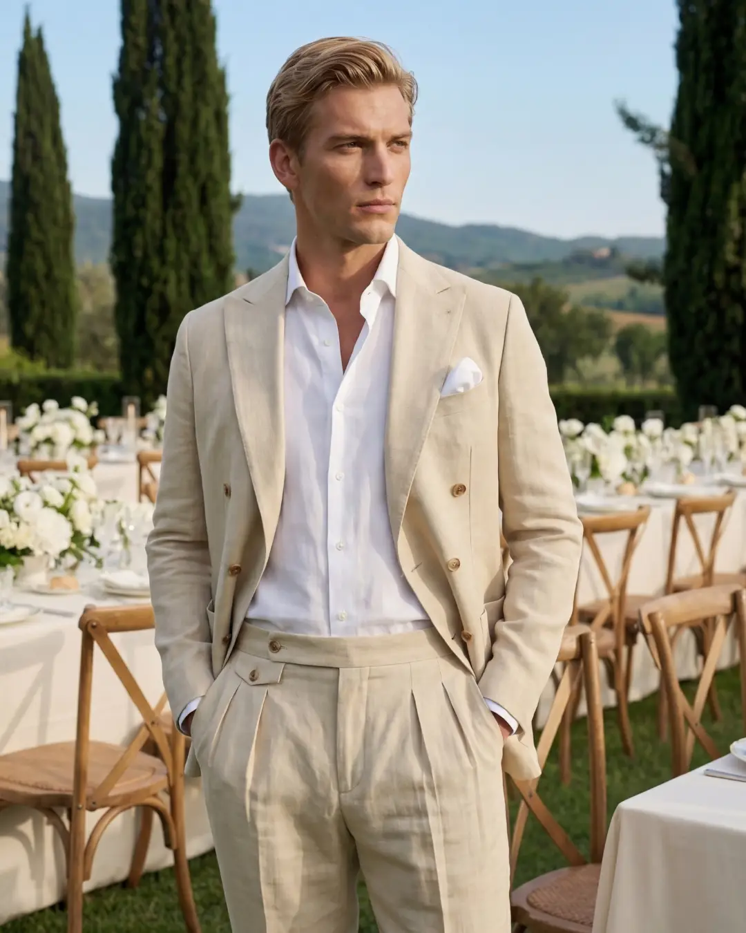 Garnitur uszyty z tkaniny o otwartym splocie, mieszanki przędz naturalnych. Proponujemy 2 wersje: z wełny, bawełny i lnu (cena 2990 pln) lub rzadszej mieszanki kaszmiru, jedwabiu i lnu (cena 3490 pln) . Ubranie idealne na letnie plenerowe imprezy. W zależności od dodatków sprawdzi się jako strój pana młodego, świadka, gościa lub na każdą inną wiosenną i letnią okoliczność w pięknym otoczeniu przyrody. Zamówienia przyjmujemy w butiku Paryska13. Czas oczekiwania 4-6 tygodni.