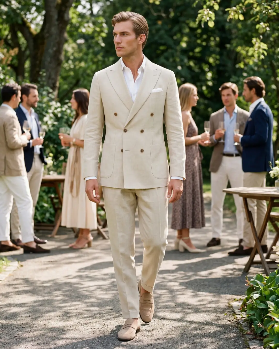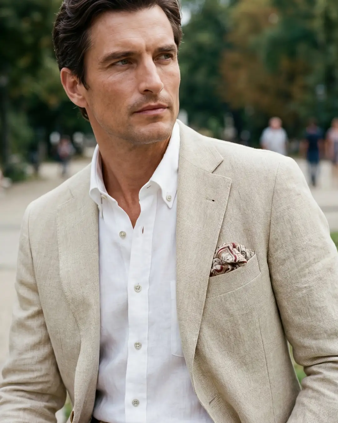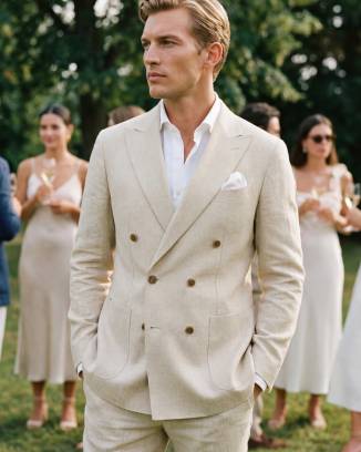 Garnitur na miarę z unikalnej, specjalnie wykańczanej lnianej tkaniny. Efekt zgniecenia jest celowy i sztuką jest uszycie garnituru bez utraty tej wyjątkowej faktury. Garnitur może być uszyty w jednej z dwóch wersji: z marynarką jedno lub dwurzędową. szyty bez konstrukcji, bez podszewki; ze spodniami z zakładkami lub bez. Zamawianie w butiku Paryska13, czas oczekiwania 4-6 tygodni. Cena 3290 jednorzędowy, 3490 dwurzędowy.